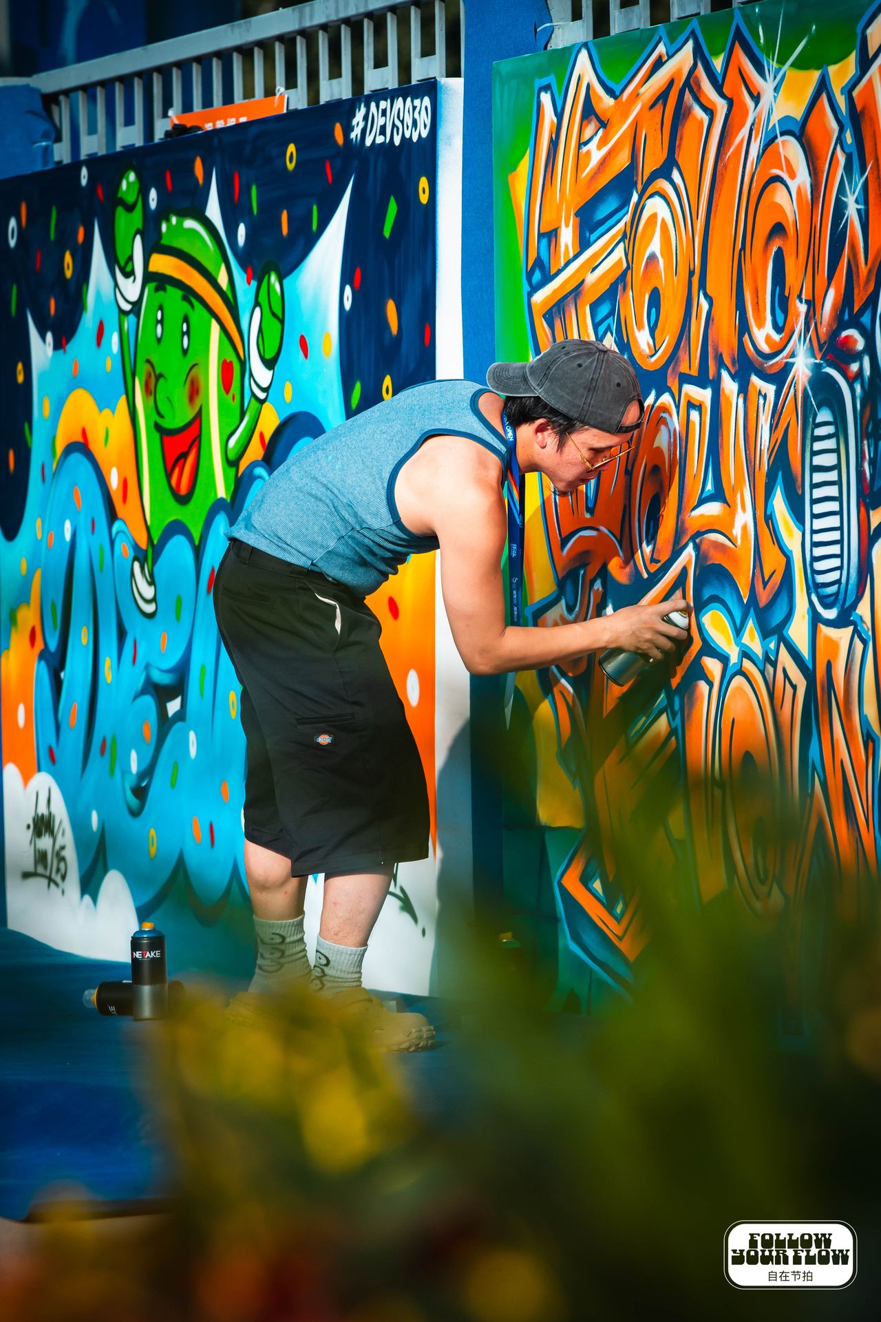 此計畫受音樂主題啟發,它將構築一條真正的東西方文化橋樑。Nour Ben Slimane運用大型標記工具,以密集而充滿活力的構圖填滿畫布表面。他的筆觸穩健又富表現力的全大寫字母銘文,不僅塑造畫面形態,更呈現出一群形似人物的圖像——他們的髮絲彷彿隨聲響節奏躍動而起。